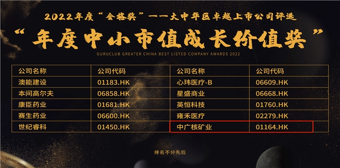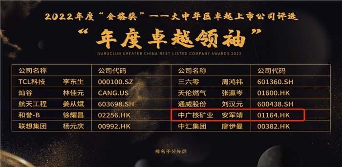 本次獲獎(jiǎng)顯示出市場(chǎng)及投資者對(duì)安軍靖先生及中廣核礦業(yè)在資本市場(chǎng)上的突出表現(xiàn)所給予的充分肯定和高度評(píng)價(jià),同時(shí)也凸顯了資本市場(chǎng)對(duì)天然鈾行業(yè)前景及公司潛力的極大認(rèn)可。中廣核礦業(yè)將持續(xù)耕耘,繼續(xù)致力于推動(dòng)行業(yè)發(fā)展,優(yōu)化社會(huì)環(huán)境治理及可持續(xù)發(fā)展,努力開拓市場(chǎng),不斷提升企業(yè)價(jià)值,用更加優(yōu)異的成績(jī)回報(bào)各位股東。